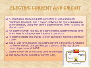 1. An electric circuit is a continuous conducting path that allows electric current to flow between the terminals of a battery or cell. Current is the flow of electric charge, often carried by electrons in a wire.