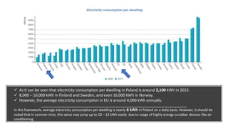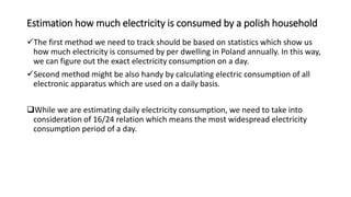 This document discusses methods for estimating household electricity consumption in Poland. It provides statistics showing the average annual electricity consumption per dwelling in Poland is around 2,100 kWh. It then estimates average daily consumption at 6 kWh but notes this may increase to 10-12 kWh in summer due to air conditioning use. A second method calculates estimated weekly consumption of common appliances totaling around 7 kWh daily. The document then discusses electricity storage options like Tesla Powerwalls and considers costs, capacities, and payback periods for households. It estimates a household could save around €585-€4,095 annually depending on the battery lifespan. Finally, it performs a SWOT analysis and provides recommendations regarding suppliers and targeting markets with higher electricity costs