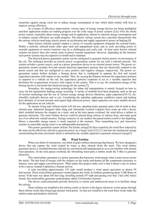 This document summarizes a research paper about generating electricity from trains passing on railway tracks. It describes using a wind turbine placed between tracks to capture wind energy from passing trains. It also describes using a variable capacitor system where the movement of passing trains causes the plates of a capacitor to move closer together, increasing the capacitance and allowing electricity to be drawn off. The system is meant to power remote railway equipment without needing to run power lines to those areas. It provides details on how both the wind turbine and variable capacitor systems would work to generate electricity from train movement and harness otherwise wasted energy.
