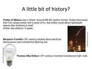 The document discusses the history and science of electricity. It explains that Thales of Miletus discovered static electricity in 585 BC by rubbing amber. Benjamin Franklin studied electrical phenomena and invented the lightning rod in the 18th century. Thomas Edison invented the incandescent light bulb in the 19th century. The document then discusses what electricity is, where it comes from, and how it works at the atomic level. It describes static electricity, current electricity, and electrical circuits. It provides safety tips for working with electricity and instructions for making a basic electrical circuit.