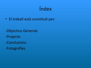 Índex El treballestà constituït per: -Objectius Generals -Projecte -Conclusions -Fotografies