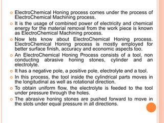 The Electrochemical Honing process is a type of electrochemical machining that provides a smooth, accurate surface finish on cylindrical parts. It involves using an abrasive tool and electrolyte to remove material from the workpiece through both electrochemical and mechanical action. Some key aspects of the process include using an abrasive tool that moves longitudinally and rotationally within the workpiece while electrolyte is fed through holes under pressure. This assists the electrochemical removal of material while the abrasives further smooth the surface. The process can achieve a surface roughness between 0.1 and 0.5 microns and an accuracy of 0.01 mm in diameter and less than 0.05 mm in roundness. It provides advantages over conventional honing