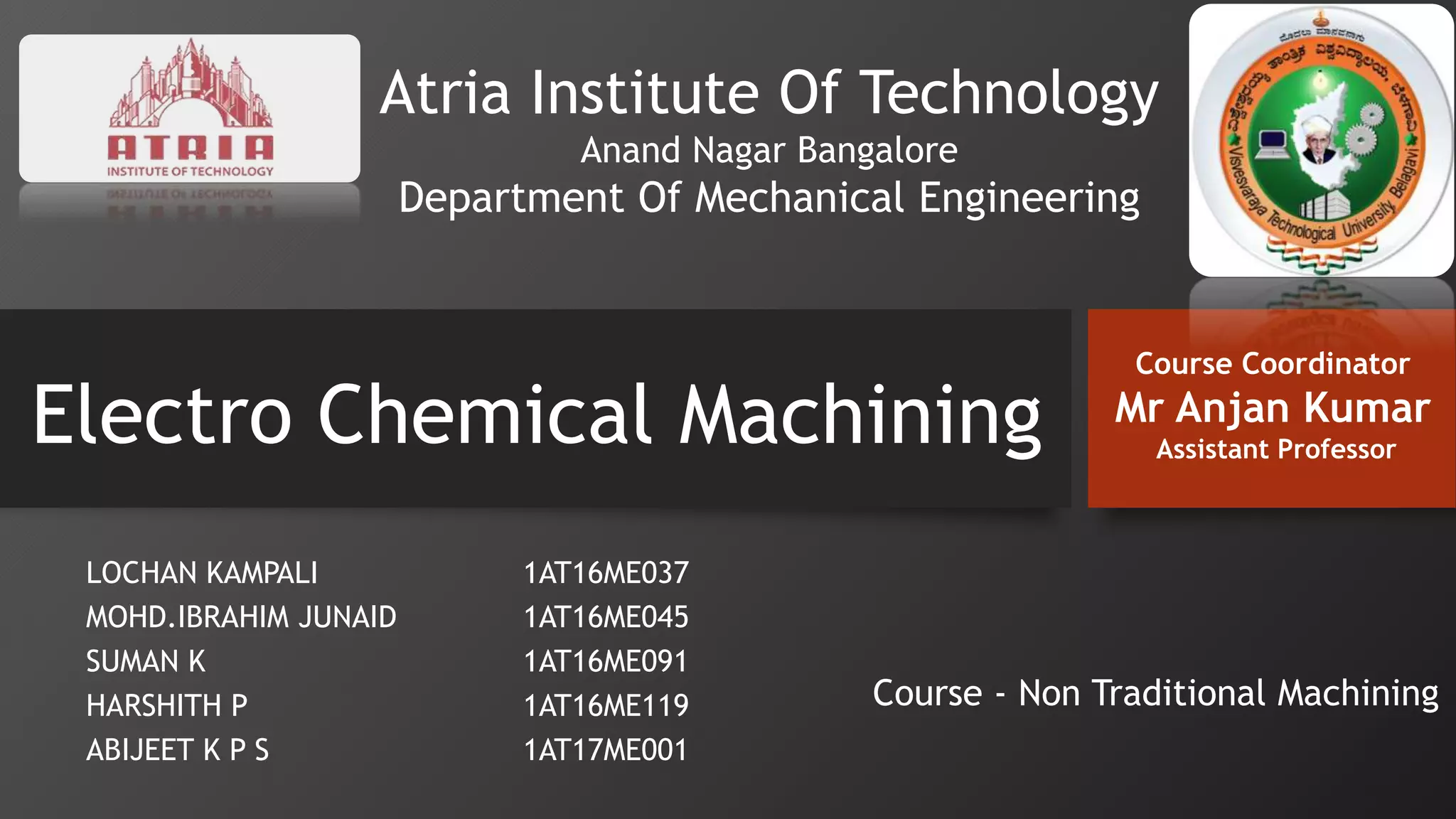 Electrochemical machining is a non-traditional machining process that removes metal by an electrochemical process. It works based on Faraday's laws of electrolysis by passing a current between an electrode tool and a metal workpiece separated by an electrically conductive fluid. The workpiece acts as the anode and dissolves as metal ions are carried away from the gap by the flowing electrolyte. Key process parameters include current density, tool feed rate, electrolyte flow velocity, and gap size, which control the metal removal rate. ECM can machine hard metals and complex shapes with good surface finish and no tool wear. Its applications include die sinking, drilling turbine blades, and micro machining.