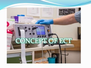 The document discusses the history and development of electroconvulsive therapy (ECT). It notes that ECT was first used in the 1500s using camphor, was modernized in the 1930s using camphor for catatonic schizophrenia, and the first official ECT treatment was in 1938 in Rome. It then describes the concept, definition, purpose, methods, mechanisms of action, types, applications of electrodes, techniques, ECT team, indications, contraindications, side effects, frequency, and the roles of psychiatric nurses in the ECT procedure.