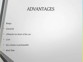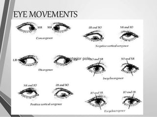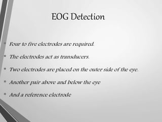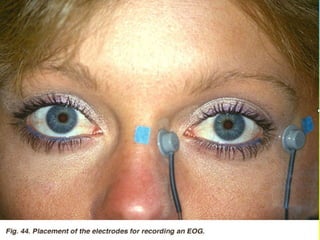 The clinical electro-oculogram (EOG) measures the electrical potential changes in the eye during dark and light adaptation, reflecting the function of the outer retina and retinal pigment epithelium. Key observations include a decrease in potential during darkness followed by a rise in response to light, with ratios compared to baseline values used to assess abnormalities such as sight loss. The document also discusses factors affecting EOG signal amplitudes, including the influence of certain medications.