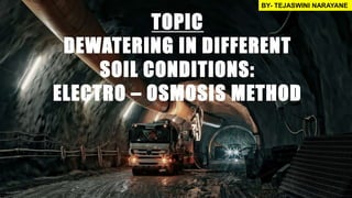 The document discusses the process of dewatering in civil engineering, emphasizing the electro-osmosis method. It covers the importance, basic processes, methods, and results of dewatering while highlighting the suitability of various techniques for different soil types. Additionally, it addresses challenges in water management and disposal related to dewatering practices.