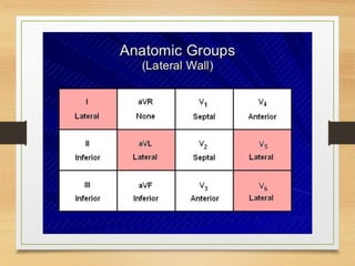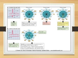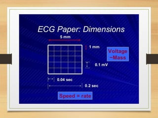 The document discusses electrical activity of the heart as recorded by an electrocardiogram (ECG). It defines key ECG terminology like waves, intervals, complexes and explains what each part of the ECG represents in terms of electrical activity in the heart. Specific waves like P, QRS, T are described in detail along with common abnormalities. Other concepts covered include heart rate calculation methods, cardiac rhythms and axis determination. The document provides a comprehensive overview of interpreting and understanding ECG readings.