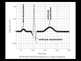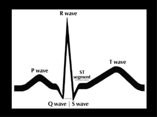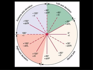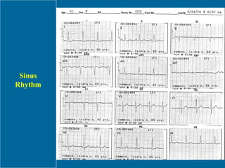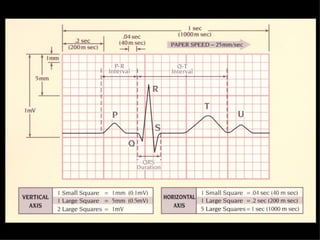2. It provides details on properly placing ECG leads and determining the cardiac axis. Common rhythms, conduction blocks, hypertrophy, and other ECG findings are explained.