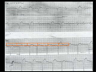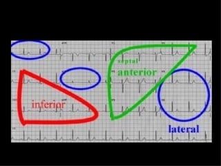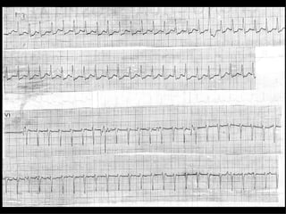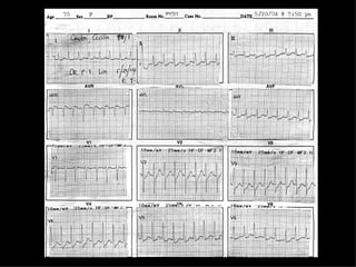 1. The document discusses electrocardiographic (ECG) interpretation including determining cardiac rate and rhythm, identifying conduction disturbances, myocardial ischemia or infarction, and other abnormalities.