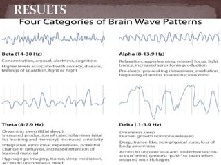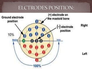 The document summarizes the electroencephalogram (EEG) test, which measures and records the electrical activity of the brain. An EEG is performed by placing electrodes on the scalp that detect brain waves produced when neurons fire. Abnormal EEG results can help diagnose conditions like epilepsy, sleep disorders, brain tumors, and head injuries by showing irregular wave patterns. The test is painless and safe, though flashing lights may trigger seizures in some patients.