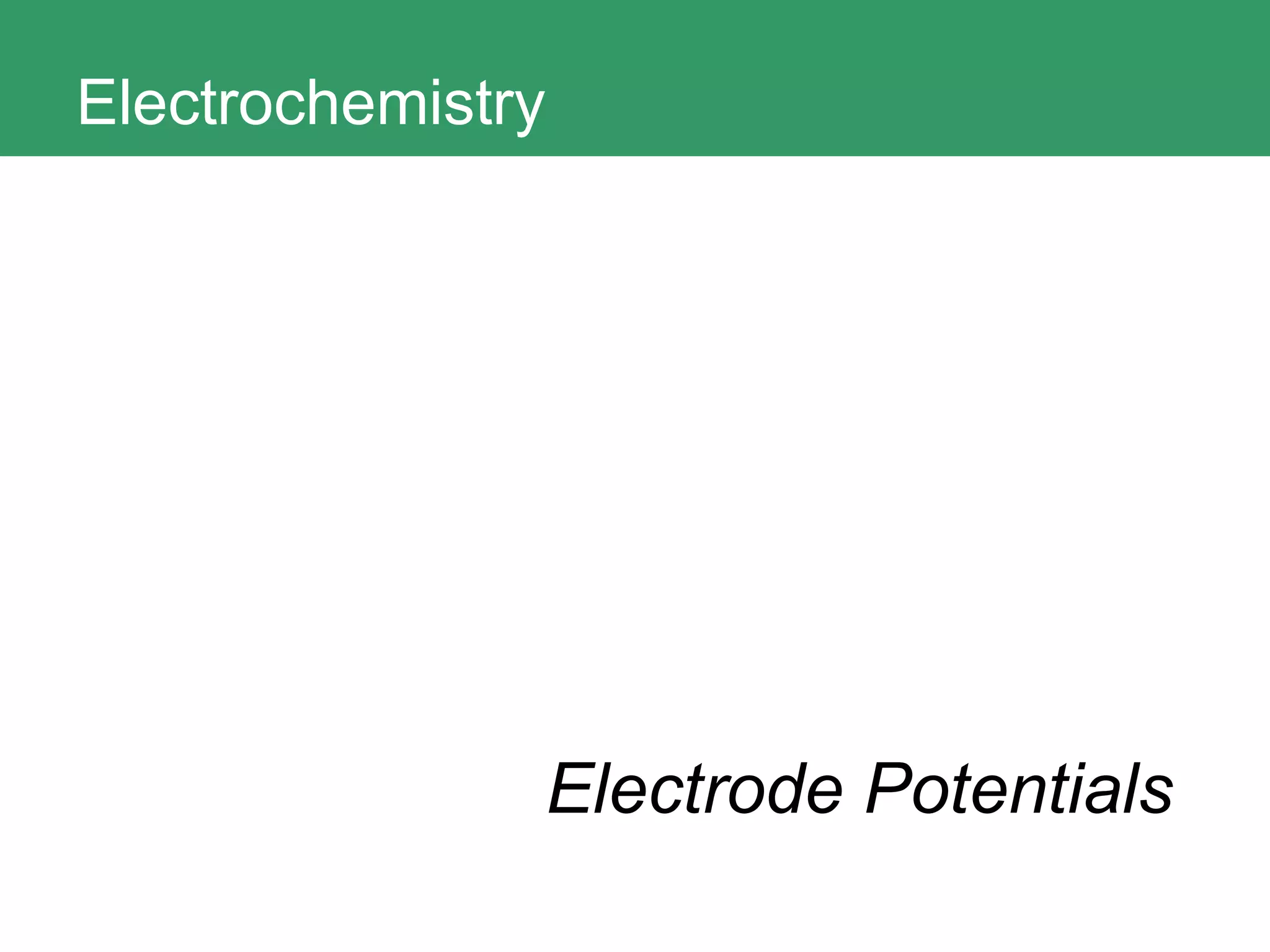 This document discusses key concepts in electrochemistry including electrode potentials, galvanic cells, and electrolytic cells. It defines electrode potentials as the electric potential arising from the separation of charges in redox half reactions. Standard electrode potentials can be measured versus the standard hydrogen electrode and indicate whether the forward or backward reaction is favored. Electrode potentials are also used to predict the feasibility of redox reactions. The document distinguishes anodes and cathodes in galvanic and electrolytic cells and how to draw cell diagrams. It provides strategies for using calculations involving current, time, moles of electrons, and Faraday's constant to solve electrochemistry problems.