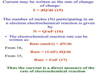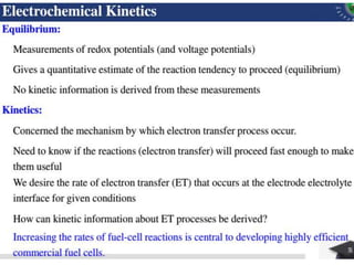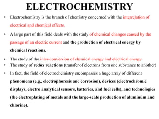 Electrochemistry is the study of chemical reactions caused by the passage of an electric current and the production of electrical energy from chemical reactions. It encompasses phenomena like corrosion and devices like batteries and fuel cells. Electrochemical cells are either electrolytic cells, where an external power source drives non-spontaneous reactions, or galvanic/voltaic cells, where spontaneous reactions produce electricity. The kinetics and rates of electrochemical reactions, as well as mass transfer of reactants, influence current production in fuel cells and other devices.