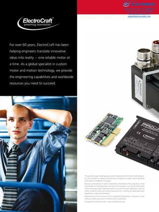 This document provides information on brushless DC motors and drives from ElectroCraft, including their RapidPower, RapidPower Plus, EA-Series, SC-Series, ACS-Series, ACE-Series, PFC-Series and PRO Series product lines. It describes the purpose, features, and applications of each product line. The document is intended as a quick reference guide for ElectroCraft products and not as a replacement for technical documentation or proper standards.