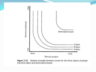 This document discusses electrodiagnostic tests used to evaluate neuromuscular disorders, including nerve conduction studies and electromyography (EMG). It provides details on reaction of regeneration testing, strength-duration curves, chronaxie and rheobase measurements, galvanic twitch-tetanus ratios, nerve excitability testing, EMG motor unit action potentials, common mode rejection ratios, waveform types, EMG circuitry, electrode types, normal and abnormal EMG findings, indications for EMG testing, and findings that can be observed on EMG that provide information about muscle and nerve diseases.
