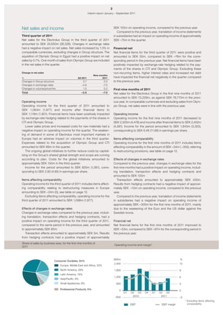 The interim report for Electrolux from January to September 2011 indicates a decline in net sales to SEK 25,650m and income for the period at SEK 825m, representing a challenging market environment with weak demand in mature markets and increased raw material costs. Despite a 2.2% increase in sales from the Olympic Group acquisition, the overall operating income fell significantly to SEK 1,098m, influenced by lower sales prices and a deteriorating market outlook. The report highlights continued strong growth in emerging markets, as well as ongoing acquisitions aimed at enhancing the company's competitive position.