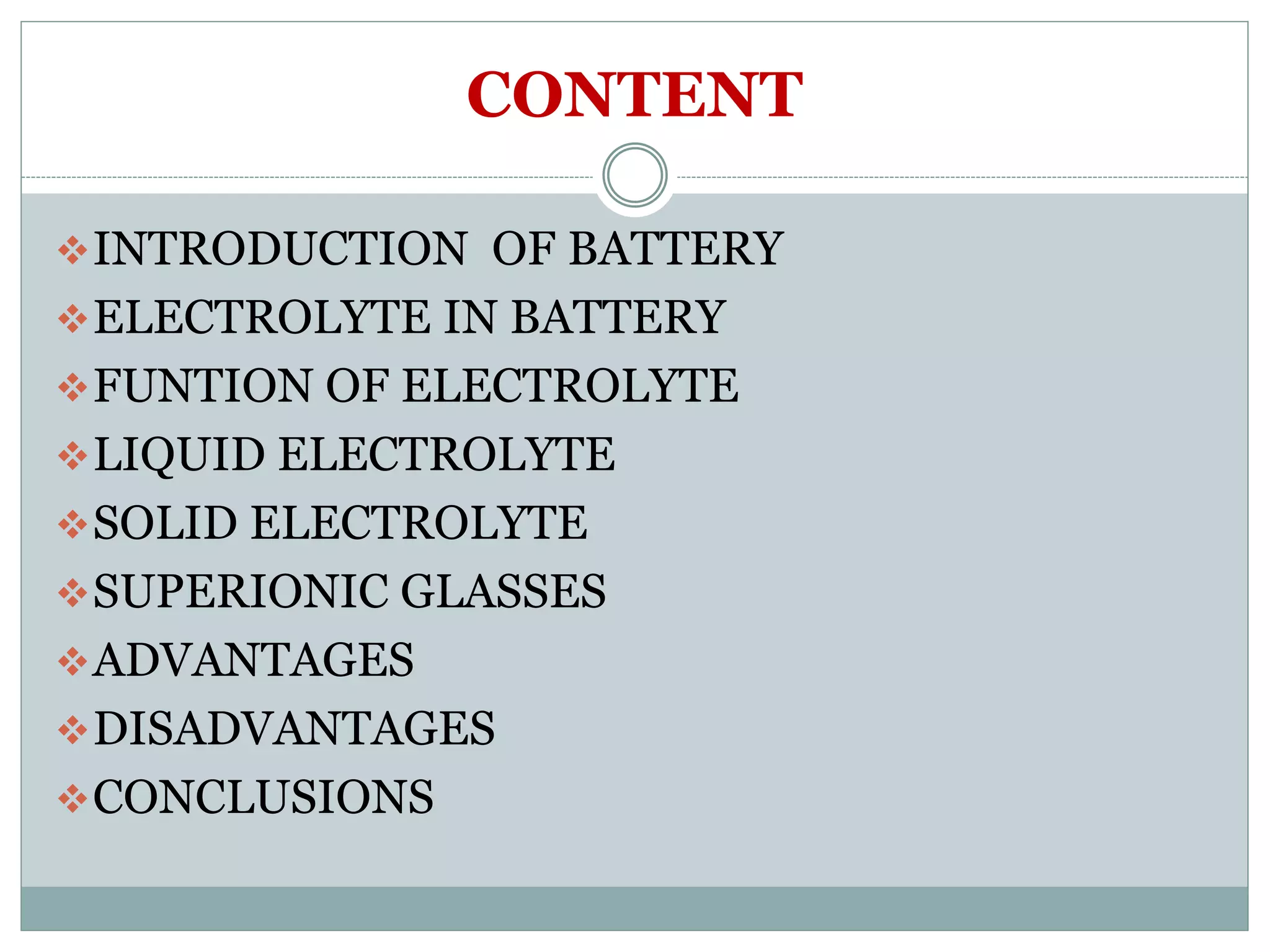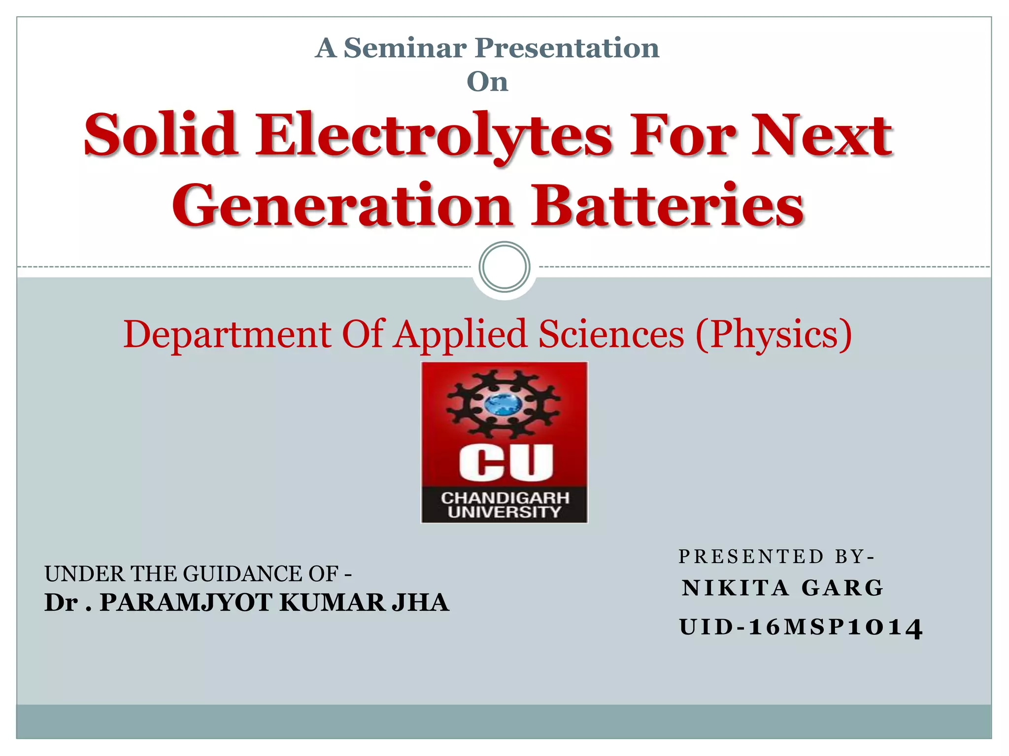 This document presents a seminar on solid electrolytes for next-generation batteries, discussing the role, advantages, and disadvantages of both liquid and solid electrolytes. It emphasizes the progression from liquid to solid electrolytes due to issues like leakage and dendritic growth, highlighting sodium-ion batteries as a promising alternative to lithium-ion batteries due to their cost-effectiveness and abundance. The document concludes by noting the significance of electrolytes in battery function and the ongoing research into materials suitable for future battery technologies.