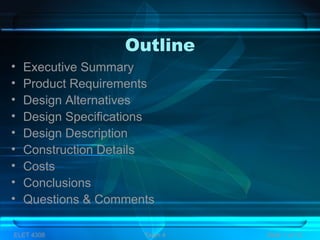 - The final design specifications include an 8051 microcontroller, Toyota hub/sp