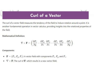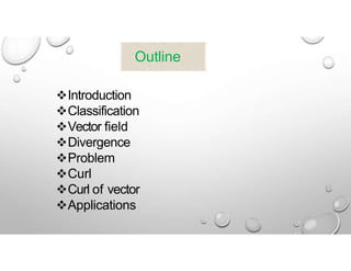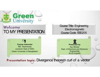 The document is a presentation on the divergence theorem and curl of a vector in the context of an engineering electromagnetic course. It outlines the mathematical, geometrical, and physical contexts, along with applications in various fields and includes problem-solving methods. The divergence theorem connects the flux of a vector field through a closed surface to the field's divergence within the volume it encloses.