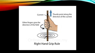 El documento describe los efectos electromagnéticos en física de nivel 11, incluyendo la interacción entre corriente y campos magnéticos, así como la inducción electromagnética. Se explican conceptos clave como el efecto de motor, el funcionamiento de generadores, transformadores y motores eléctricos, con énfasis en la relación entre la corriente, el campo magnético y la fuerza ejercida sobre conductores. También se presentan experimentos y reglas (como la regla de la mano derecha de Oersted y la regla de la mano izquierda de Fleming) para comprender estos fenómenos.