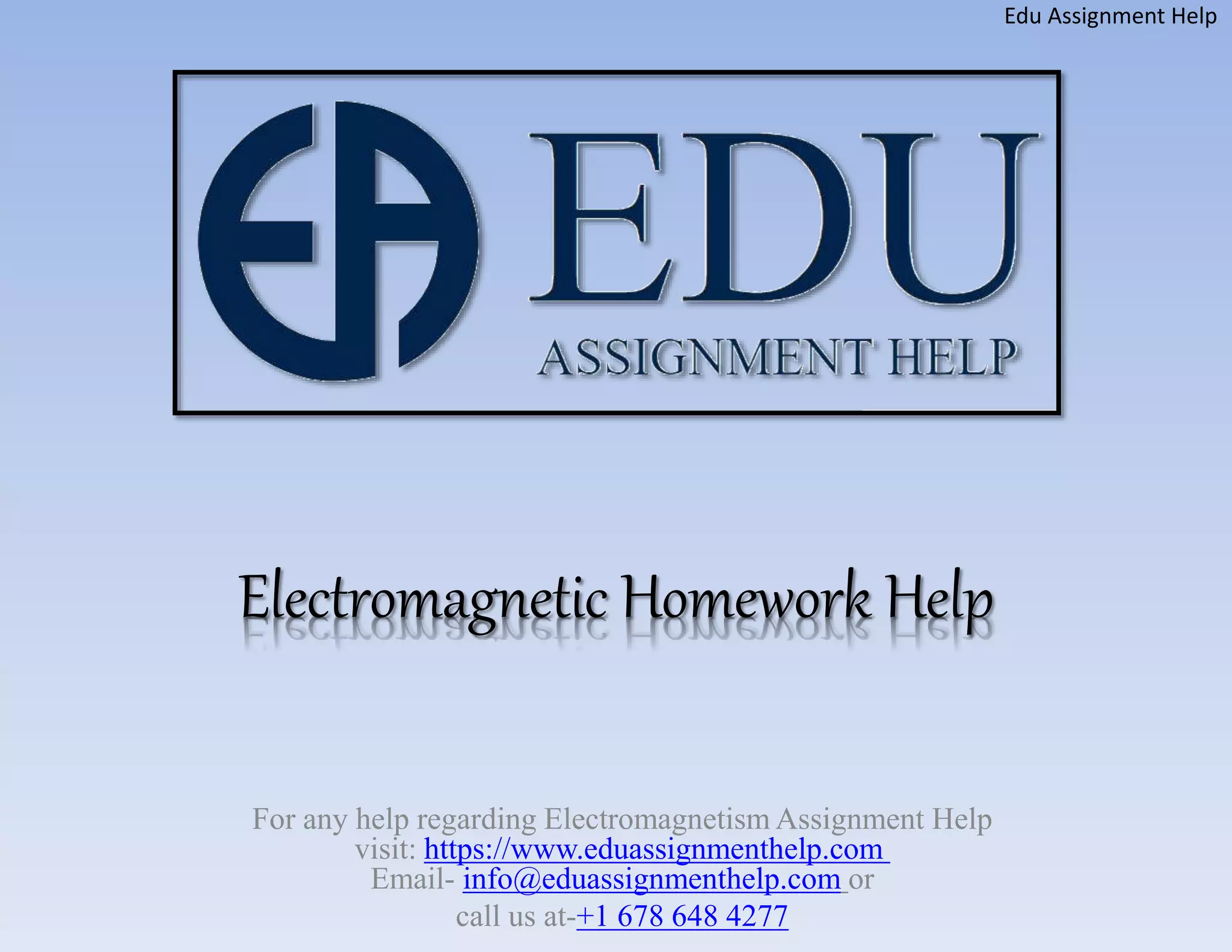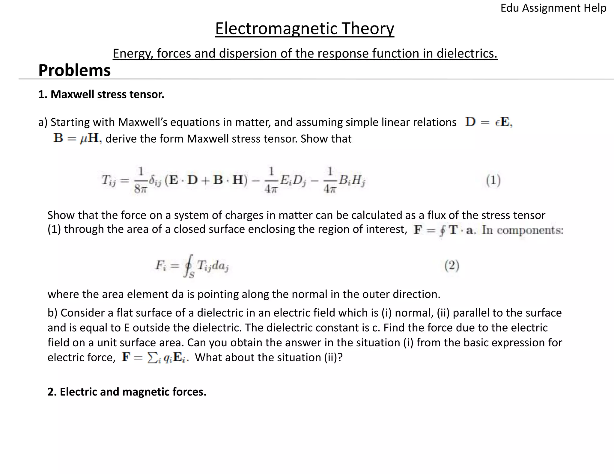 This document provides information and homework problems related to electromagnetic theory and electromagnetic homework help. It includes 6 problems about Maxwell's stress tensor, forces on dielectric materials and conductors due to electric and magnetic fields, energy balance in conductors, the memory function, and using Kramers-Kronig relations to obtain sum rules and properties of the dielectric function. Students are directed to a website and contact information for assistance with electromagnetic assignment help.