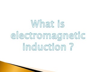 This document provides information about electromagnetic induction through a presentation created by students. It defines electromagnetic induction as the process where a changing magnetic field induces a current in a conductor. An experiment is described where a coil of wire connected to a galvanometer shows a deflection when a magnet is moved in and out of the coil, demonstrating induced current. Fleming's right hand rule for determining the direction of induced current is also explained. The document concludes by noting how the principle of electromagnetic induction is employed in electric generators to produce large currents for homes and industry.