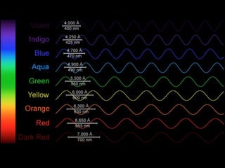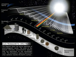 This document summarizes different types of electromagnetic radiation, including light, radio waves, microwaves, infrared, visible light, ultraviolet, x-rays, and gamma rays. It discusses their properties such as wavelength and frequency. Key topics covered include how light travels in waves, the electromagnetic spectrum, uses of different wavelengths such as communication and food heating, and properties of visible light like color.