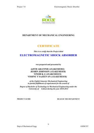 This document is a project report submitted by four students for their Bachelor of Technology degree in Mechanical Engineering. The project is on developing an electromagnetic shock absorber. The report includes an introduction to different types of shock absorbers, a literature review on investigations into shock absorbers and related technologies, a description of the problem statement and objectives of the project, details of the mechanical and electrical components used, results and discussions on the design and performance of the shock absorber, and the scope for future work.