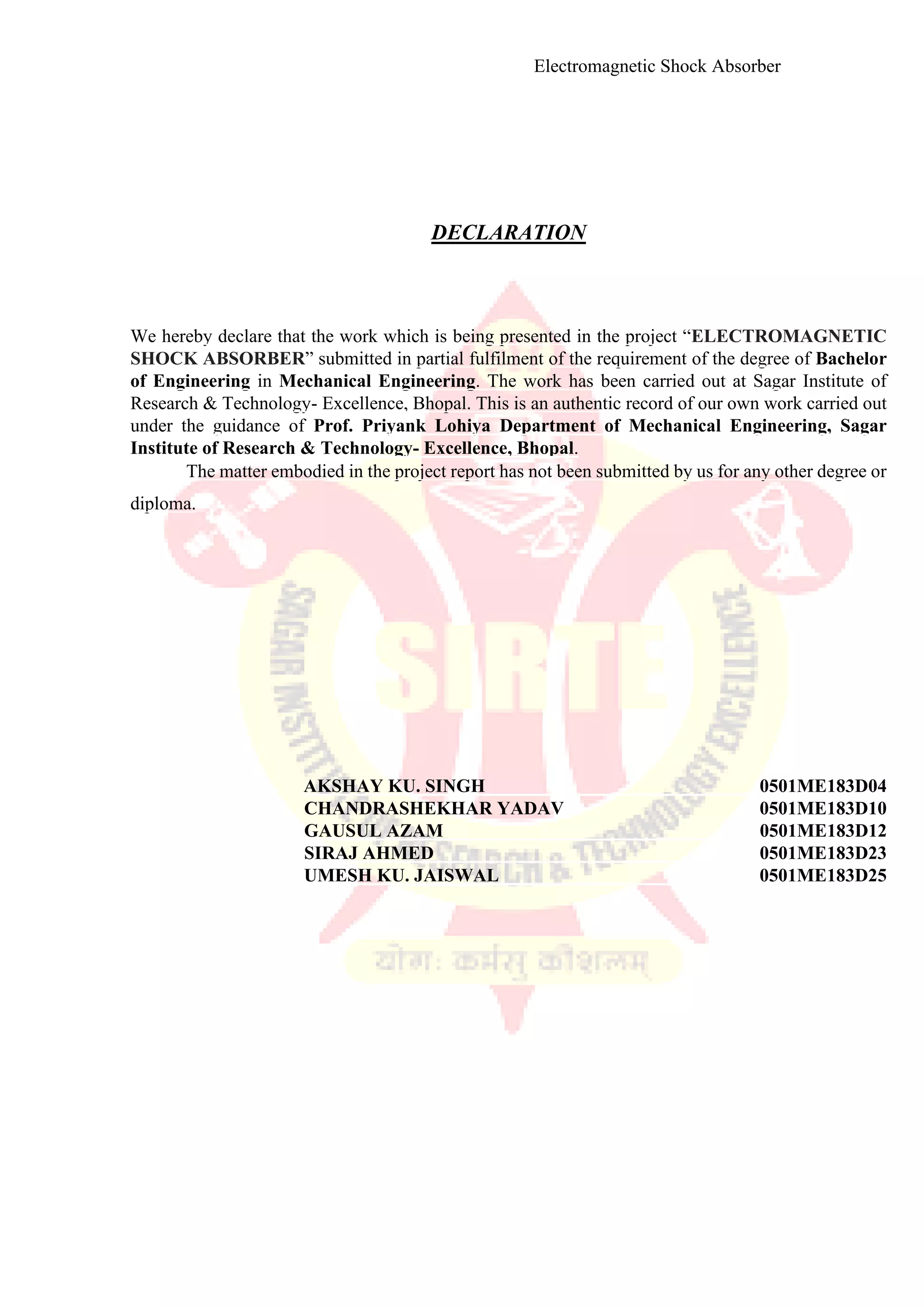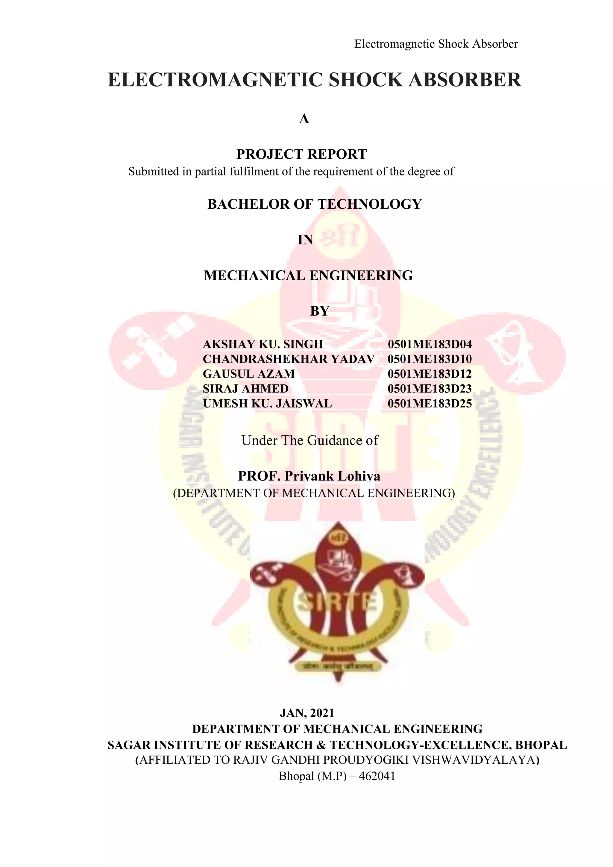The document describes an electromagnetic shock absorber project report submitted by five students. It includes sections on the introduction, literature review, problem statement, components and description, results and discussions, scope for future work, and references. The project involves designing an electromagnetic shock absorber that uses repulsive magnetic forces between permanent magnets and an electromagnet to absorb shock loads in vehicles. It provides details on the mechanical and electrical components of the design as well as theoretical analyses and considerations for manufacturing.