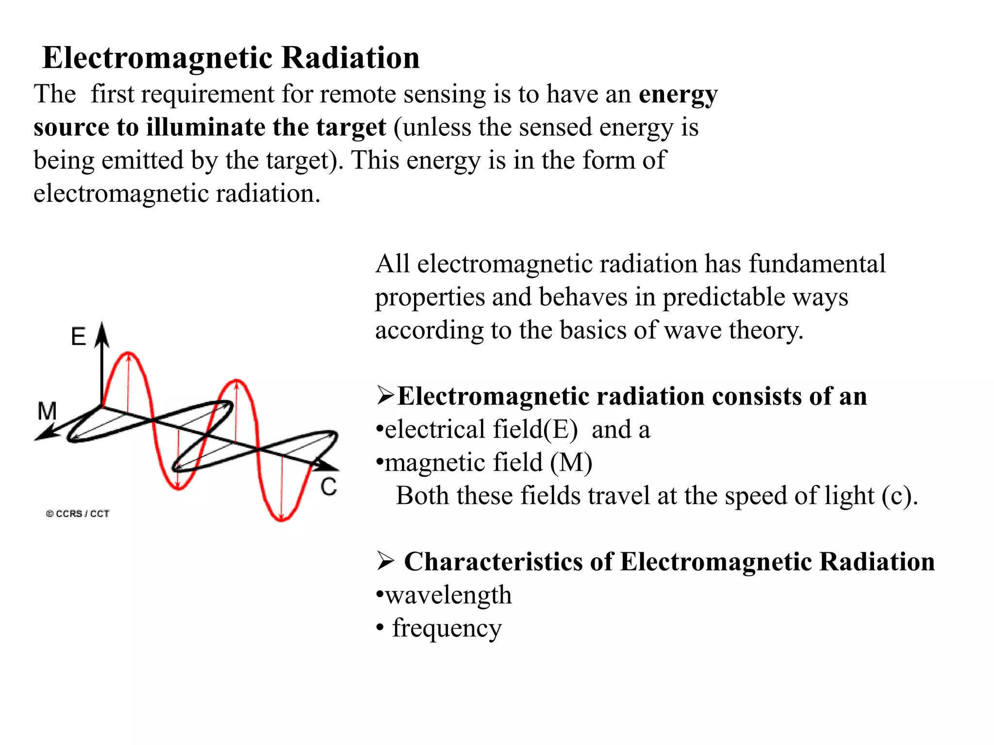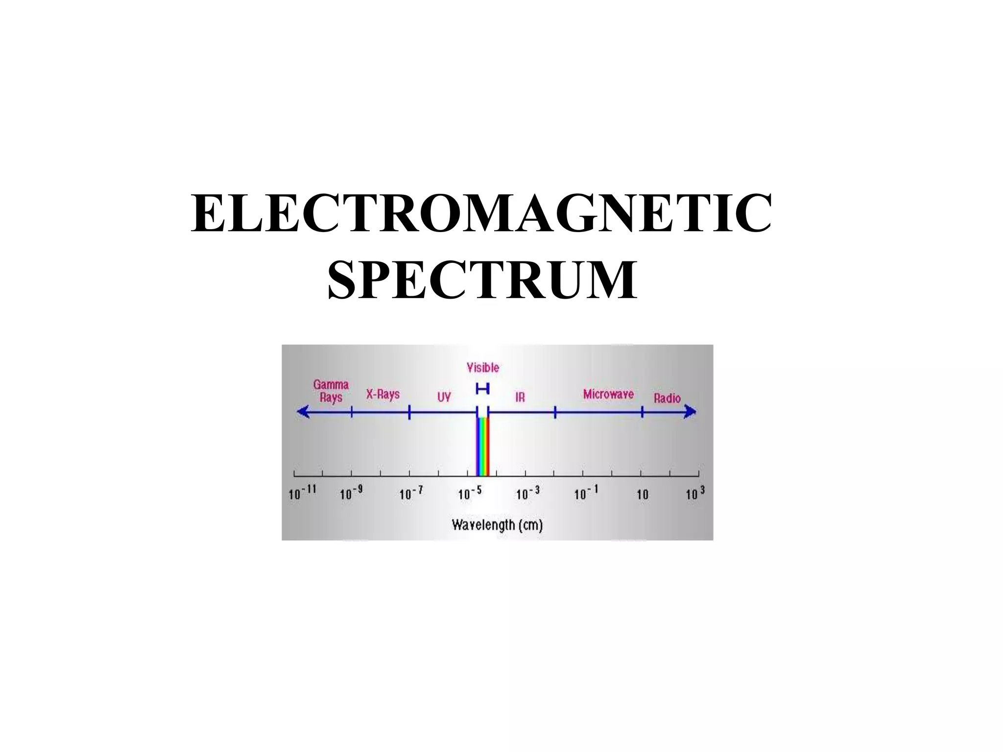 1. The electromagnetic spectrum ranges from gamma rays to radio waves, with different types of radiation having different wavelength ranges. Several regions of the spectrum are useful for remote sensing including ultraviolet, visible, infrared, and microwaves.