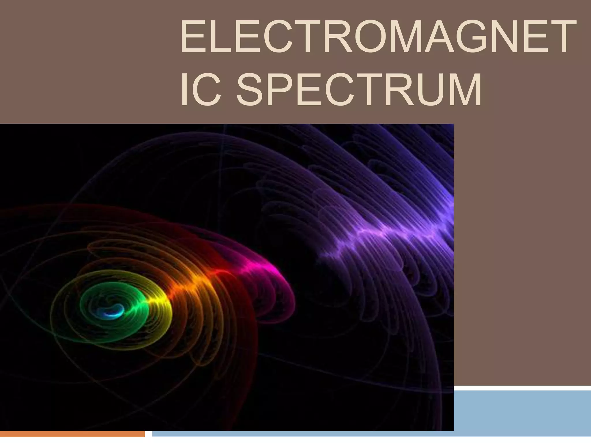 The document describes the electromagnetic spectrum and its applications. It states that the electromagnetic spectrum consists of 7 main components from radio waves to gamma rays, which are classified based on their wavelength. Electromagnetic waves transfer energy, travel at the speed of light, and exhibit wave properties. The different types of electromagnetic waves have various applications, such as radio waves for communication technologies, microwaves for wireless devices and cooking, infrared for thermal imaging, visible light for sight and lasers, ultraviolet for sterilization, X-rays for medical imaging, and gamma rays for cancer treatment.