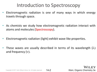 The document provides an introduction to the electromagnetic spectrum and spectroscopy. It discusses how electromagnetic radiation exhibits wave-like properties with a wavelength and frequency. The wavelength is the distance between peaks and troughs, while frequency is the number of waves passing a point per second. Wavelength and frequency are inversely proportional and related by the velocity of light. Higher frequency radiation has higher energy. Spectroscopy studies how electromagnetic radiation interacts with atoms and molecules. Different regions of the spectrum probe different molecular structures.