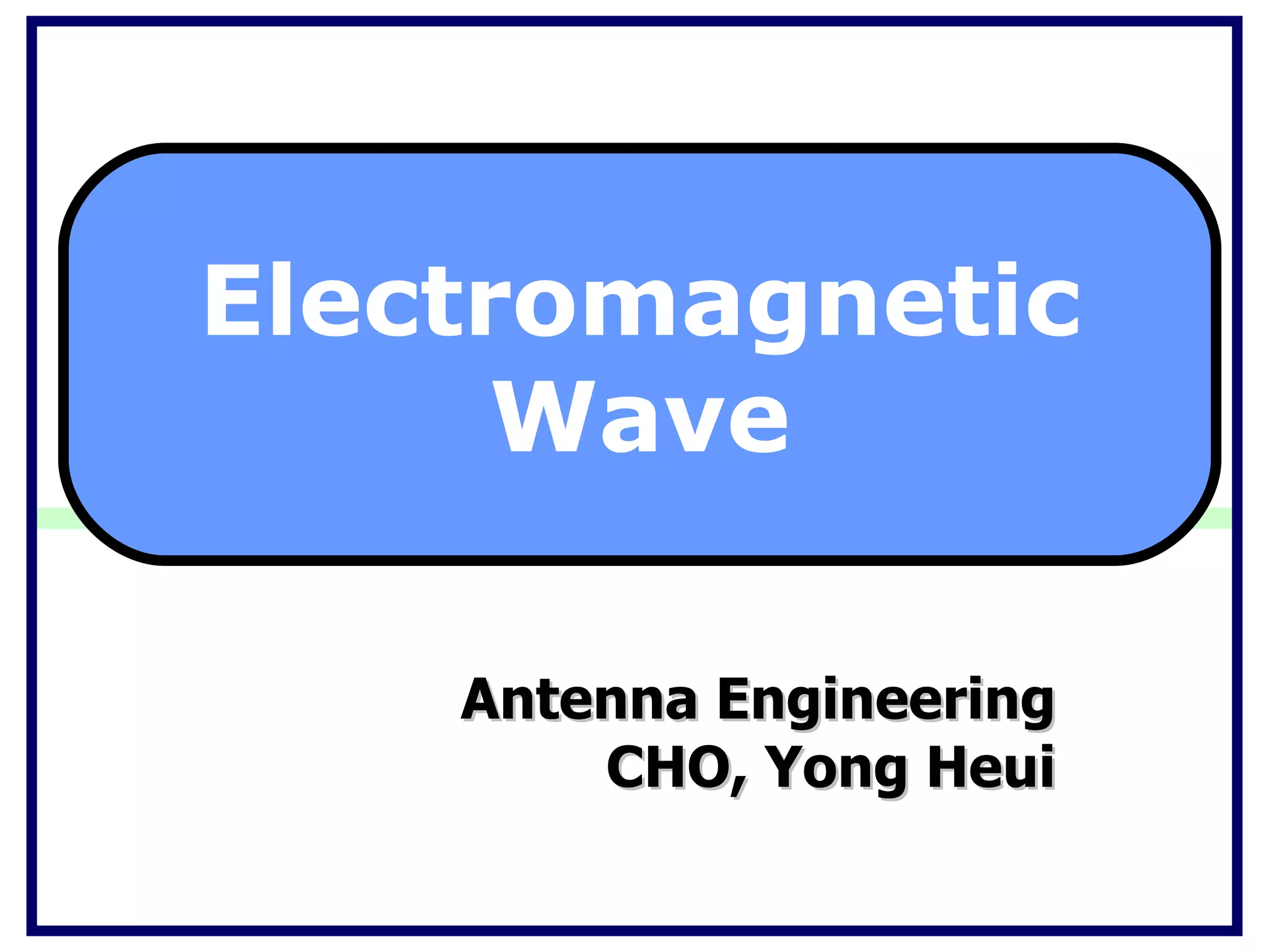 The document discusses antenna engineering and electromagnetic wave propagation, focusing on wave equations for electric and magnetic fields. It includes topics such as wavefront propagation, wave impedance, reflection and transmission coefficients, and various polarizations. Additionally, it explores transmission line theory and the comparison between distributed and lumped elements.