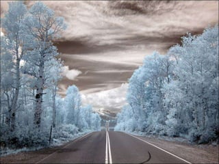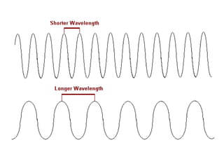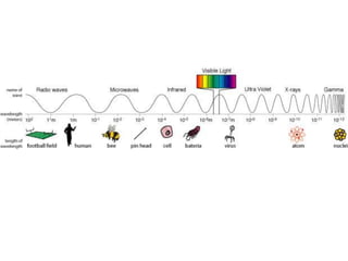 Electromagnetic waves are produced by oscillating electric charges and come in a spectrum ranging from radio waves to gamma rays. The energy of electromagnetic waves decreases as the frequency decreases, with gamma rays having the highest frequency and shortest wavelength, and radio waves having the lowest frequency and longest wavelength. Visible light makes up a small portion of the electromagnetic spectrum that humans can see with our eyes, ranging from red to violet wavelengths. Electromagnetic waves travel fastest in empty space.