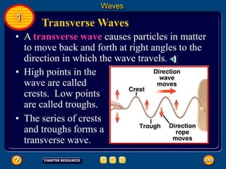 Waves transfer energy and can be transverse or electromagnetic. Transverse waves cause particles to move at right angles to the wave's direction of travel, with crests and troughs forming the wave pattern. Electromagnetic waves contain electric and magnetic fields that vibrate perpendicular to the direction of travel. Properties like wavelength, frequency, and amplitude describe a wave's characteristics. Waves transfer energy and can reflect, refract, or diffract as they encounter different materials.