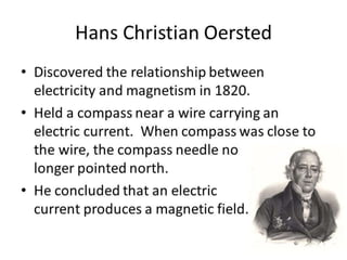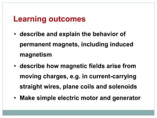 This document provides information on learning outcomes, misconceptions, and a brief history of magnetism and electromagnetism. The key learning outcomes are to describe the behavior of permanent magnets and how magnetic fields arise from moving charges. The brief history section outlines important discoveries and developments in electromagnetism from 1600 to the 1860s, including Oersted's discovery relating electricity and magnetism. Misconceptions discussed include that all metals are magnetic and that static charges interact with magnet poles.