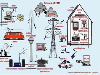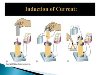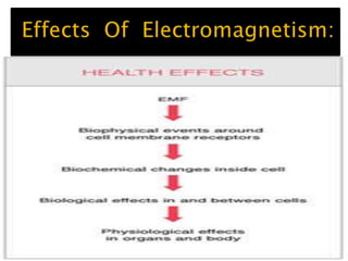 This document discusses electromagnetism and its applications. It explains that a moving electric charge creates magnetic fields and changing magnetic fields create electric charges. It describes how coils of wire and electric currents are used to create electromagnets. It also discusses how changing magnetic fields produce electric fields and vice versa. Finally, it provides some examples of applications of electromagnetism like electric motors, dumping cars, loudspeakers, MRI, communication systems, radar, and medical imaging.