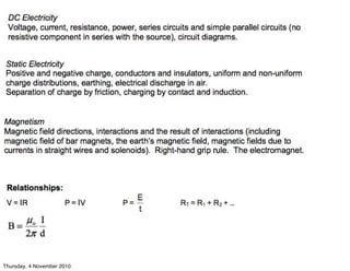 3. The document addresses electric fields, magnetic fields, and how to determine current and magnetic field directions using the right hand grip rule. It also covers how magnetic field strength is affected by current and distance from the wire.