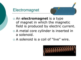 This document discusses electromagnets and the factors that affect their magnetic fields. It explains that an electromagnet's magnetic field is produced by electric current flowing through a coil. The key factors that strengthen the magnetic field are: