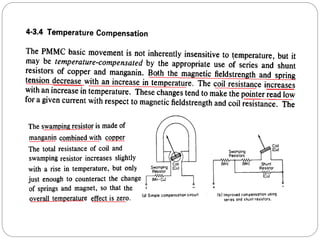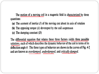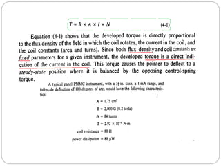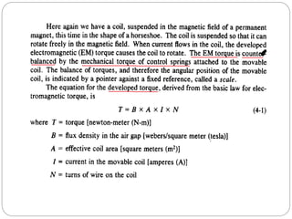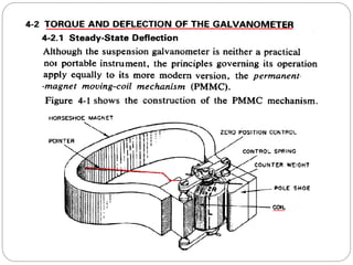 The document provides an overview of electromechanical instruments, focusing on analog and digital meters such as galvanometers, ammeters, voltmeters, and ohmmeters. It explains their principles of operation, measurement principles, and includes formulas and sample problems for practical understanding. Different types of galvanometers and specific applications like micro-ohmmeters and megohmmeters are also discussed.