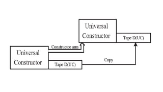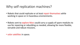 This document discusses the concept of self-replicating electromechanical robots. It describes how robots made of modular cubes that can bend and manipulate other cubes could replicate themselves by bending over to pick up additional cubes and adding them to the growing replica. The process is inspired by DNA replication. Key requirements for self-replicating robots include mobility, communication, processing, and sensors. An example is given of a soft, self-regenerating robotic octopus arm that could mimic an octopus' muscular structure and virtually unlimited degrees of freedom. The goal is to create robots that can replicate or repair themselves to operate more flexibly in space or hazardous environments.