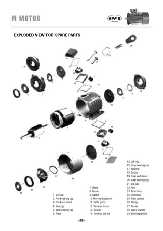 - An exploded view diagram shows the main components including the frame, end shields, bearings, stator, and rotor.