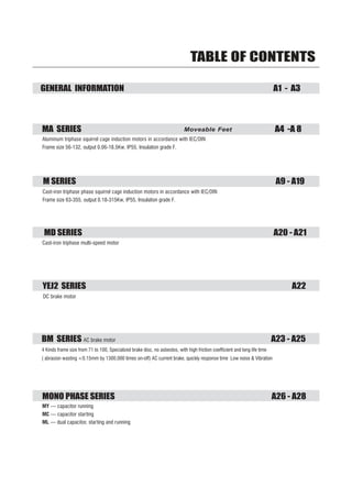 The document provides an overview of MA series aluminum triphase squirrel cage induction motors. Key details include: