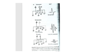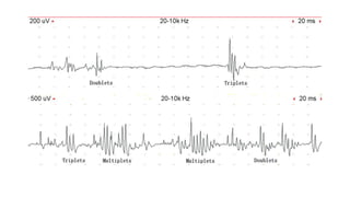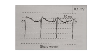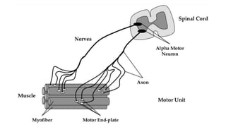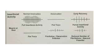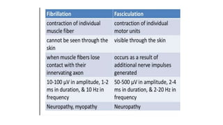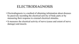 This document provides information about electromyography (EMG). EMG is a test that evaluates the health and function of muscles and the nerve cells that control them. It involves inserting a needle electrode into a muscle to record electrical activity from muscle fibers and nerves. Abnormal spontaneous electrical activities in muscles can indicate neurological or muscular disorders. EMG is useful for diagnosing conditions like amyotrophic lateral sclerosis, myasthenia gravis, and muscular dystrophy. It provides information about the location and severity of nerve or muscle damage.