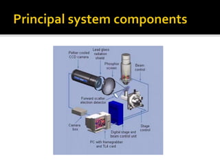 The document discusses electron backscatter diffraction (EBSD), including a brief history, the principal system components, how patterns are formed, operating conditions, and uses. EBSD allows determining crystallographic orientations, misorientations, texture trends, grain size, boundary types, and phases. It works by detecting Kikuchi patterns formed by elastic backscatter of electrons from tilted crystalline samples, and analyzing the patterns to determine crystallographic data. EBSD is now widely used to quantitatively characterize microstructures and textures in materials.