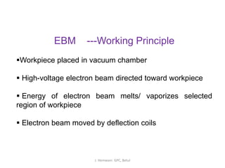 Electron beam machining (EBM) involves directing a high-velocity beam of electrons in a vacuum chamber to melt or vaporize material from a workpiece. The electron beam is generated in a gun and focused onto a small spot on the workpiece using magnetic coils. This localized heating allows for precise material removal with minimal heat effects. EBM can machine nearly any material and produces close tolerances, but requires expensive equipment and vacuum systems. Common applications include machining wire drawing dies and manufacturing semiconductor and optical components.