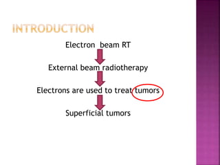 Electron beam radiotherapy uses megavoltage electron beams ranging from 6-20 MeV to treat superficial tumors within 6 cm of the skin surface. It provides a uniform dose at a specified depth with rapid dose fall-off, sparing deeper tissues. Common tumors treated include skin, lymphomas, and breast tissue. Electrons deposit dose via interactions with atomic electrons and nuclei, with dose decreasing rapidly beyond the 90% depth. Beam characteristics like central axis depth dose, isodose curves, and field size must be carefully considered for treatment planning.