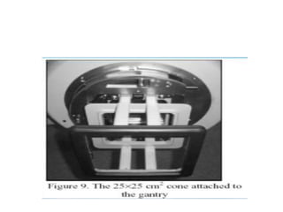 1) Electron beam therapy uses high-energy electrons between 6-20MeV to treat superficial tumors less than 5cm deep. It is useful for cancers of the skin, eye, breast, head and neck, and gastrointestinal tract.