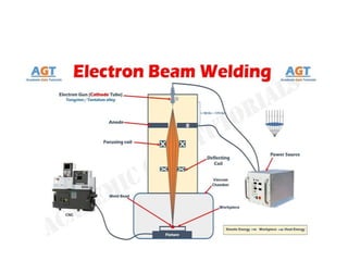 Electron beam welding is a fusion welding process that uses a stream of high-speed electrons generated by an electron gun and accelerated using electrical fields to melt and join materials. The electron beam is tightly focused using magnetic fields onto the materials to be welded. It allows for welding of thin to thick plates from 0.1mm to 300mm thick and offers advantages like high welding speed, precision, cleaner welds, and ability to weld exotic alloys or dissimilar materials. However, it has limitations like requiring electrically conductive materials and expertise to operate complex equipment.