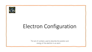 The document explains electron configuration, detailing how to determine the position and energy of electrons in an atom using quantum numbers. It covers the principles of electron distribution in energy levels and sublevels, including the Aufbau principle for filling orbitals. Additionally, it provides examples and practice exercises for writing electron configurations for various atoms and ions based on their atomic number and periodic table position.