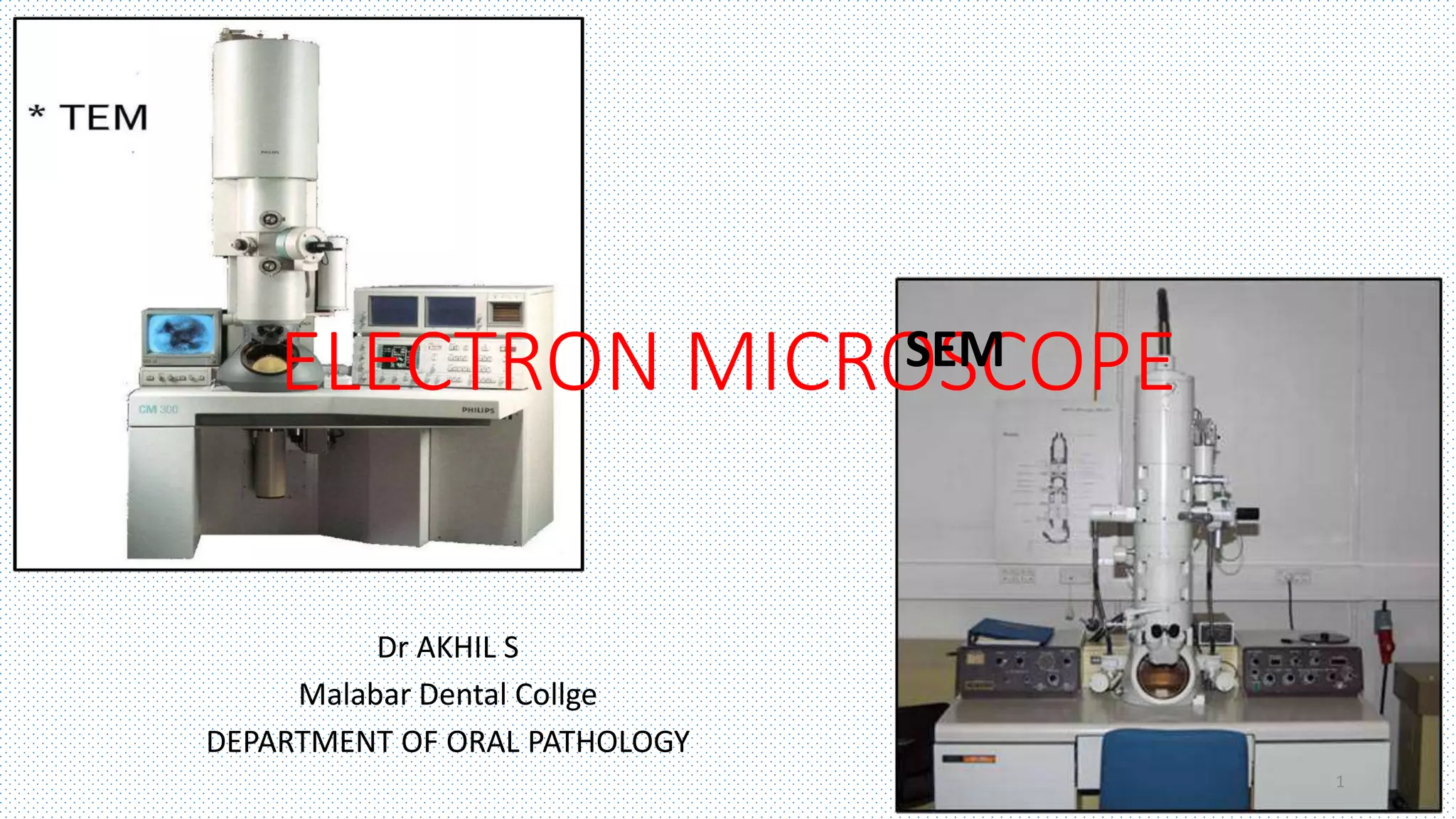 The document discusses electron microscopy, including the basic components and functioning of transmission electron microscopes and scanning electron microscopes. It explains that electron microscopes use a beam of electrons rather than light to view specimens and can achieve much higher magnifications. Key parts of electron microscopes are identified as the electron source, electromagnetic lens system, sample holder, imaging system, and vacuum system. Applications of electron microscopy in pathology and limitations are also summarized.